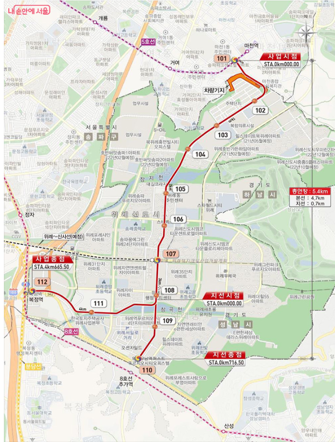 위례선 트램은 전국 최초의 무가선 노면전차입니다. 기존 트램처럼 전차선(전기선)을 설치하지 않고, 차량 지붕에 대용량 배터리를 탑재해 친환경적으로 운행합니다. 전차선이 필요 없기 때문에 도시 미관을 해치지 않고 건설비용도 줄일 수 있습니다. 특히 위례선은 서울 송파 마천역(5호선)에서 출발해 복정역(8호선·수인분당선), 남위례역(8호선)을 연결하는 5.4km 구간에 12개 정거장과 1개의 차량기지를 갖추고, 10편성이 투입됩니다.