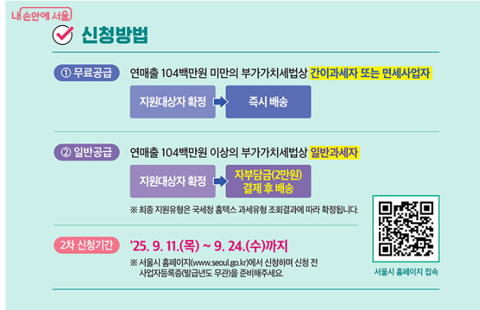 • 최종 공급 유형 확정: 신청 접수 후 국세청 홈택스 과세유형 조회 결과에 따라 결정되며, 10월 말 문자 안내 예정입니다.