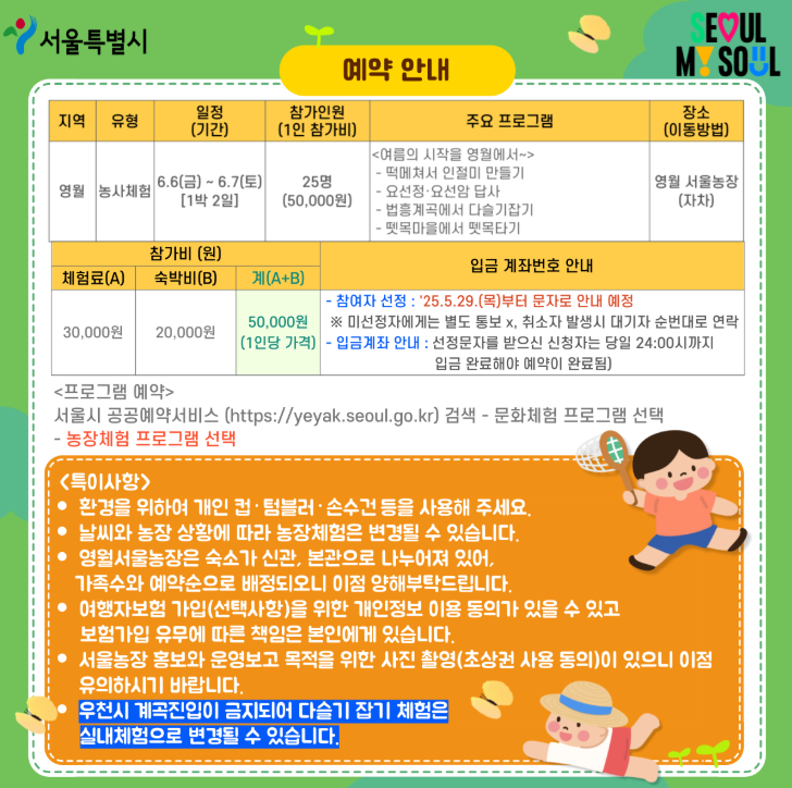 ※ 모집인원 초과접수시 대기자로 관리, 취소 발생시 영월 서울농장에서 순서대로 연락드림