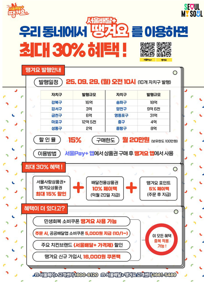 서울시가 발행하는 ‘서울배달+땡겨요’ 배달전용상품권은 단순한 지역화폐가 아닌, 시민과 소상공인 모두에게 실질적인 혜택을 주는 스마트한 정책입니다. 2025년 9월 29일부터 시작되는 이번 발행은 10개 자치구를 대상으로 하며, 소비자는 상품권 15% 할인 + 10% 페이백 + 5% 포인트 적립을 통해 최대 30%의 혜택을 누릴 수 있습니다. 여기에 농림축산식품부의 소비쿠폰까지 더해져 체감 절약 효과는 더욱 커집니다. 또한 자체 배달 서비스 ‘땡배달’을 통해 배달비 절감, 실시간 위치 확인, 빠른 배달시간 등 서비스 품질도 크게 개선됩니다. 이번 기회는 단순한 할인 이상의 가치를 제공하며, 서울시민의 생활비 절약과 소상공인의 매출 증대라는 두 가지 효과를 동시에 이끌어낼 것입니다. 배달앱을 자주 이용하신다면 이번 정책을 꼭 활용해 보시길 권장드립니다.