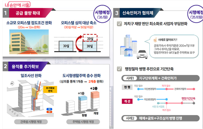 - 오피스텔 접도 조건 완화 : 기존 20m → 12m로 완화. 이제 보조간선도로에서도 오피스텔 건축 가능.