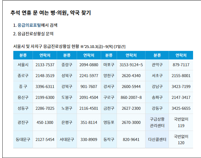서울시 다산콜센터(120)와 자치구 누리집을 통해 병원, 약국, 쓰레기 배출일 등 생활 정보를 미리 확인하시면 보다 안전하고 쾌적한 명절을 보내실 수 있습니다.