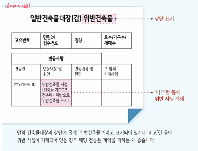 건축물대장을 열람했을 때 상단에 ‘위반건축물’ 표시가 있다면 절대 계약하지 마세요.