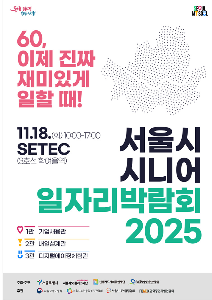 서울시가 오는 2025년 11월 18일(월) 오전 10시부터 오후 5시까지 SETEC(3호선 학여울역 1번 출구)에서 ‘서울시 시니어 일자리박람회 2025’를 개최합니다.