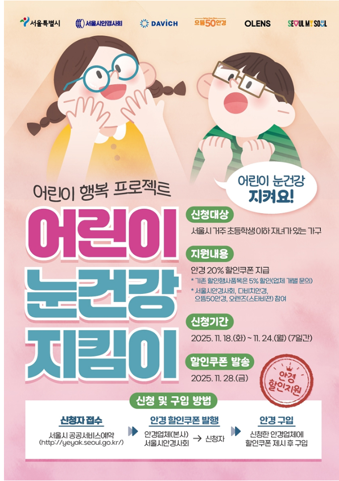 ‘서울 어린이 눈건강 지킴이 사업’은 서울시가 초등학생 이하 어린이의 눈건강을 위해 제공하는 실질적인 지원 프로그램으로, 시력 검사와 안경 구매 시 사용할 수 있는 최대 20% 할인쿠폰을 무료로 제공합니다. 올해 마지막 접수인 4차 신청은 11월 18일부터 24일까지 진행되며, 참여업체 4곳과 서울 전역 1,402개 매장에서 쿠폰을 사용할 수 있습니다. 2012년 1월 1일 이후 출생한 서울 거주 어린이를 둔 가정이라면 누구나 신청할 수 있으며, 신청자는 11월 28일에 문자로 쿠폰을 받아 6개월 동안 사용할 수 있습니다. 기존 신청자도 중복 업체 신청만 아니라면 다시 신청할 수 있어 혜택을 놓칠 필요가 없습니다. 올해 마지막 기회이므로 자녀의 눈 건강을 챙기고, 실질적인 비용 절감까지 가능한 이번 사업은 모든 가정에서 꼭 신청해야 할 필수 혜택입니다.