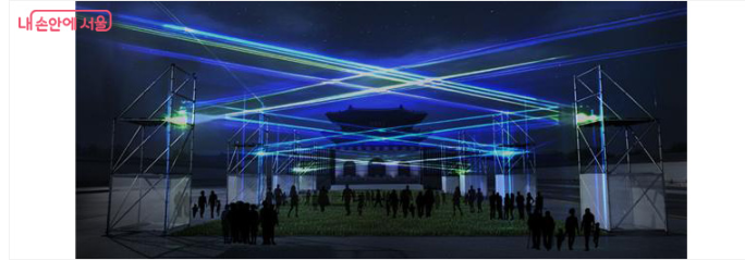 세종대왕 동상 북측부터 광화문을 가로지르는 운수대통로는 길이 26m의 거대한 빛조형 작품으로 꾸며집니다. 한국 전통 일월오봉도와 단청을 현대적으로 재해석했어요.