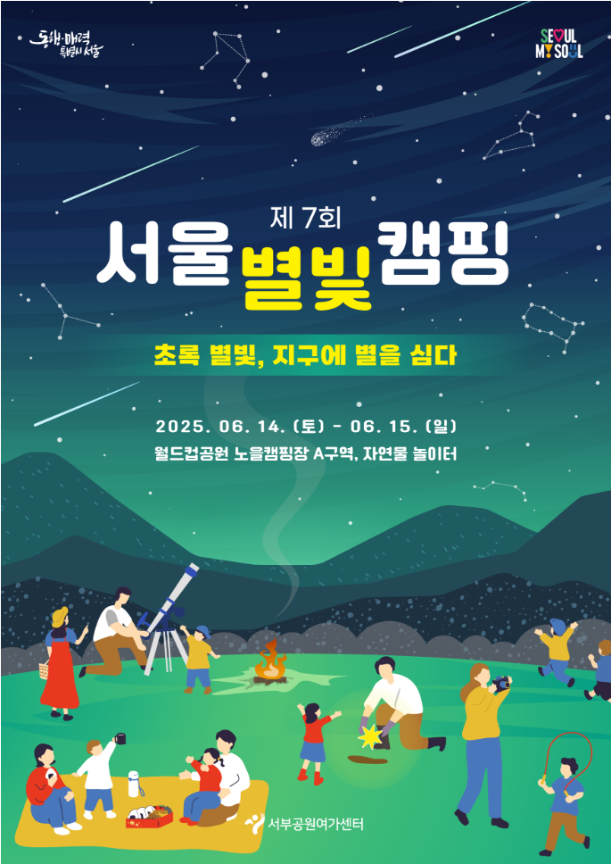 오늘은 월드컵공원 노을캠핑장에서 6월 14일부터 15일까지 '초록 별빛,지구에 별을 심다'라는 주제로 1박 2일간 진행되는 ‘제7회 서울별빛캠핑’ 참여자를 5월 26일 오후 2시부터 모집한다는 소식을 전해 드리겠습니다.