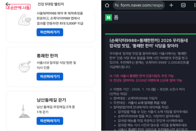 서울시가 인증한 ‘통쾌한 한 끼’ 참여 식당에서 잡곡밥 메뉴를 먹고, 사진과 영수증을 업로드하면 미션이 완료됩니다.