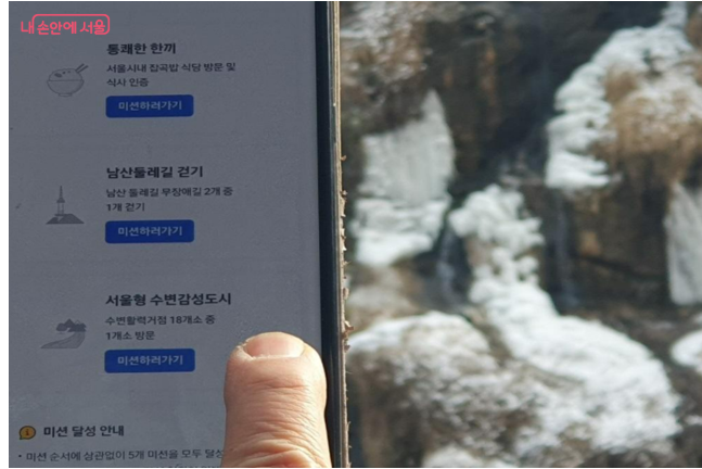 겨울철에는 빙벽 폭포로 유명한 장소답게 풍경이 매우 인상적이었고, 외국인 관광객들도 많이 찾는 명소였습니다. 폭포를 배경으로 사진을 찍고 인증을 완료하니 또다시 포인트가 지급되며 성취감이 배가되었습니다.