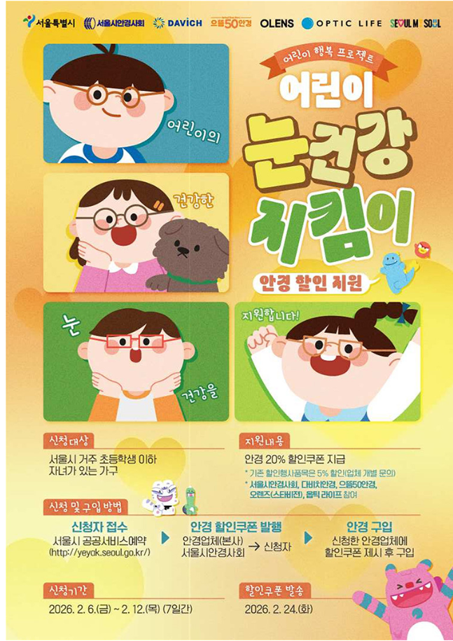 새 학기를 앞두고 자녀의 시력 관리가 걱정되시는 부모님들께 놓치면 후회할 초대형 혜택이 찾아왔습니다. 서울시가 ‘서울 어린이 눈건강 지킴이 사업’을 통해 무료 시력검사 + 안경 구매 최대 20% 할인쿠폰을 지원합니다. 신청만 해두셔도 최대 수만 원의 비용 절감 효과를 누릴 수 있어 반드시 챙겨야 할 정책 혜택입니다.