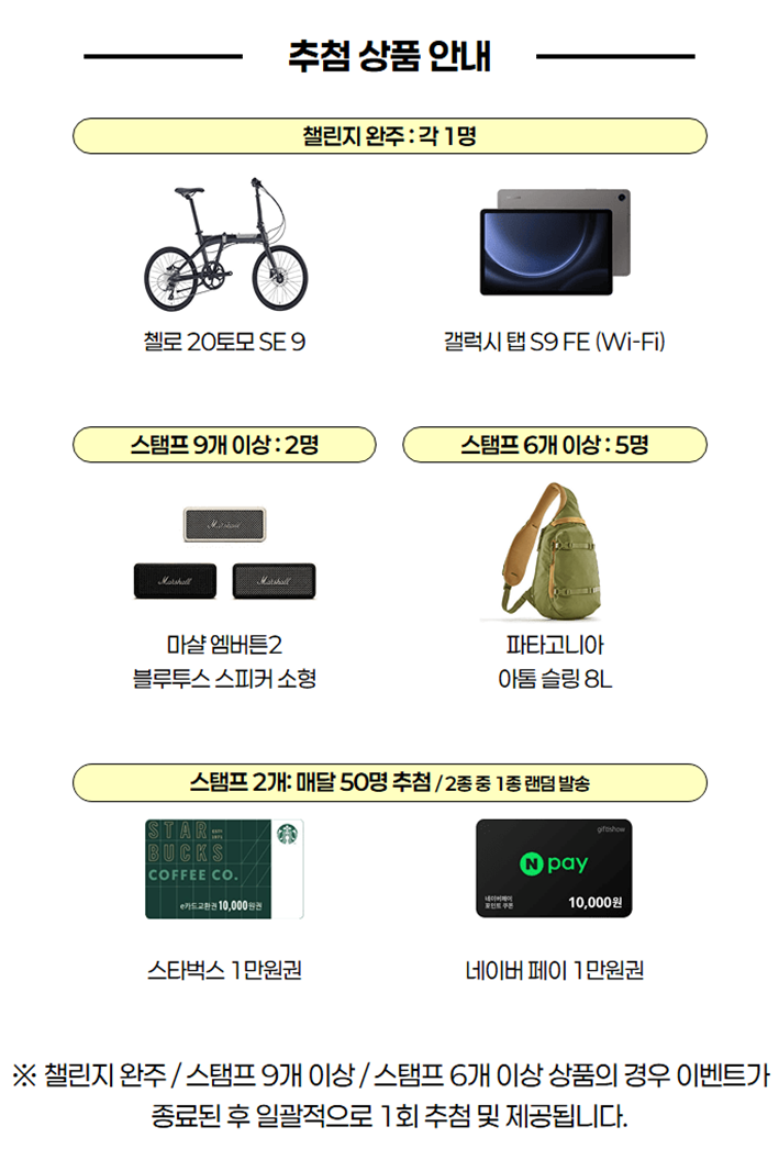 ※ 챌린지 완주 / 스탬프 9개 이상 / 스탬프 6개 이상 상품의 경우 이벤트가 종료된 후 일괄적으로 1회 추첨 및 제공