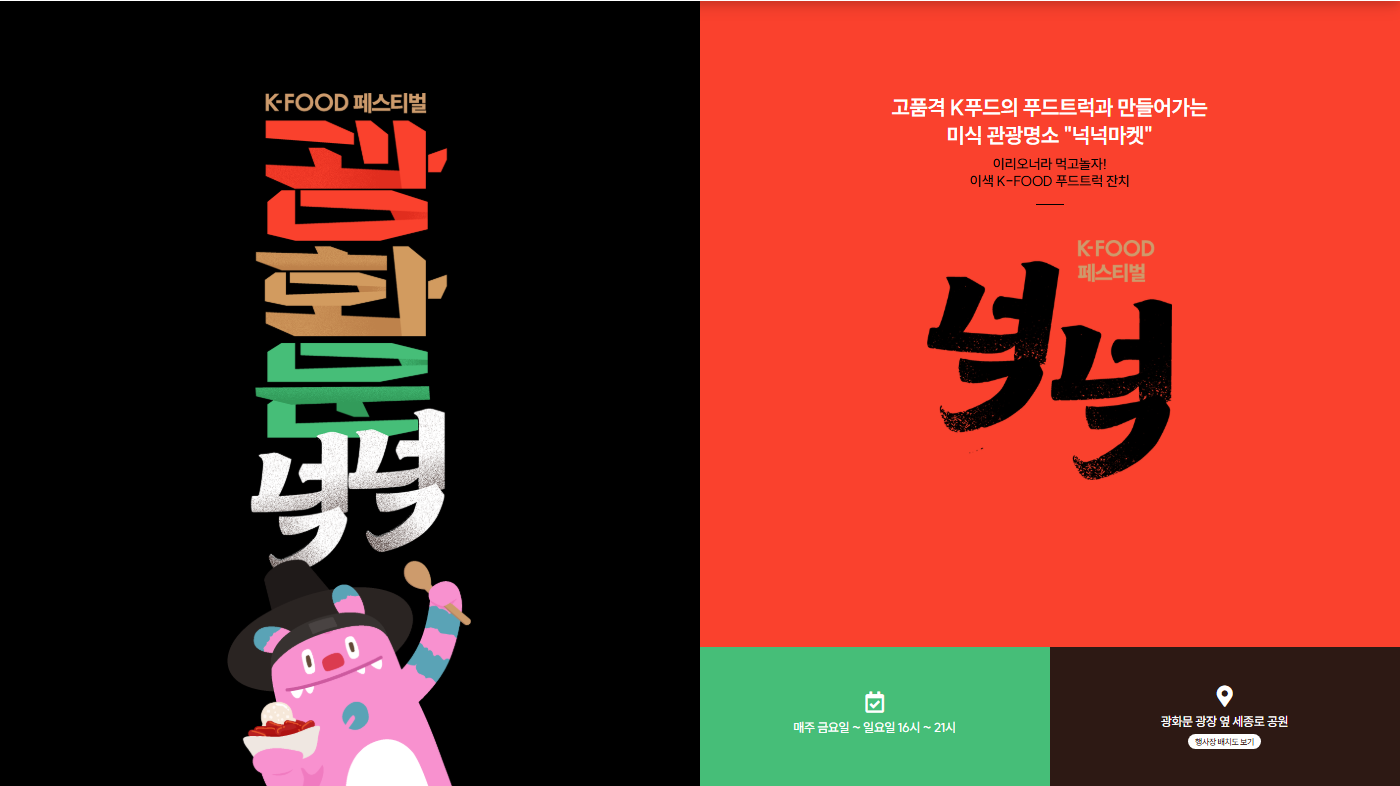 서울 한복판 광화문 세종로공원에서 주말마다 미친 라인업의 K-푸드가 몰려 옵니다! 이름하여 K-푸드 페스티벌 넉넉.