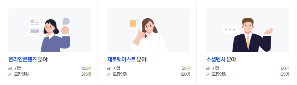 올해는 총 220개 기업이 참여한 가운데 ▴AI·온라인콘텐츠 ▴제로웨이스트 ▴소셜벤처, 3개 분야 600명을 모집합니다. 기존의 온라인콘텐츠 분야에 인공지능(AI)이 새롭게 추가됐으며,
