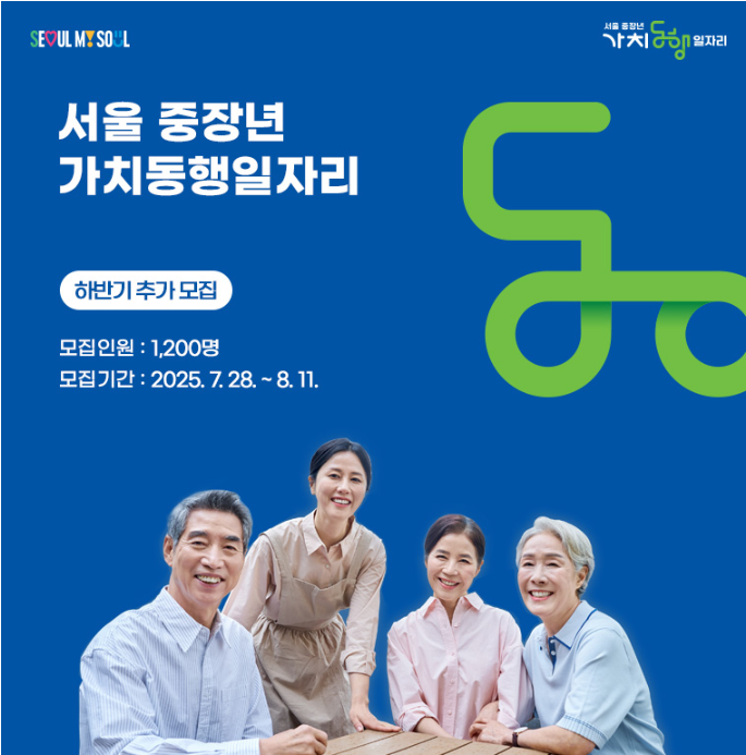 서울시가 2025년 하반기 ‘중장년 가치동행일자리’ 참여자 1,200명을 추가 모집한다.